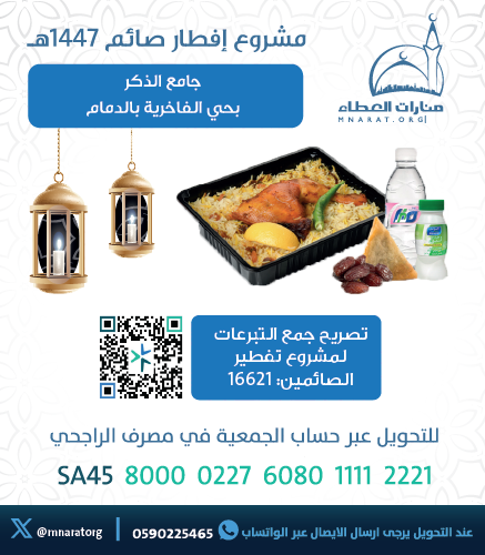 ساهم معنا في مشروع إفطار الصائمين بجامع الذكر بحي الفاخرية بالدمام خلال شهر رمضان المبارك لعام 1447هـ